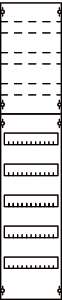 Innenausbausystem, Verteilerfelder, montiert auf EDF-Profil, für Reiheneinbaugeräte und Reihenklemmen, Rasteinheit 8 RE = 1200 mm, Feldbreite 1 = 250 mm, 96 Platzeinheiten, Reihenabstand: 125, Ausbau mit Hutprofilschiene 35 x 15 mm mit Lochung für Drahthalter, für Einbaugeräte nach DIN 43880, Abdeckungen aus Kunststoff, 90 Grad Druck-Drehverschluss, RAL 7035, Ausführung der Abdeckung: mit Ausschnitt, einsetzbar ab einer Schranktiefe von 120 mm, Verteilerfelder oder Feldkombinationen müssen die gleichen Rastereinheiten haben wie die Schränke, in die sie eingebaut werden. Bei Stand- und Reihenschaltschränken müssen zwei Felder oder Feldkombinationen übereinander eingebaut werden. Die EDF-Profilschienen sind im Lieferumfang enthalten.