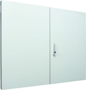 Brandschutz-Vorsatztür, Baureihe VF, für den Innenbereich, mit Blendrahmen und Tür, Schutzart IP54, Baustoff nach A2 - nicht brennbar, geprüft nach DIN 4102-1, rauchdicht, Feuerwiderstand 30 min geprüft nach DIN 4102-2, Brandlastdämmung 30 min in Anlehnung an DIN 4102-11, Funktionserhalt 30 min in Anlehnung an DIN 4102-12, oberflächenbeschichtet, in RAL 7035, Gehäuse aus nicht brennbarem Material, Doppeltür, Tür aus nicht brennbarem Material, mit Schwenkhebel mit Halbzylinder, Türöffnungswinkel 180 Grad, Türanschlag rechts und links, Abmessungen in mm (H x B x T): 2095 x 1295 x 51, Blendrahmenmaße in mm (H x B x T): 2095 x 1295 x 22, Rasteinheit 12 RE, Bauhöhe 8, Feldbreite 4, Platzeinheiten 576
