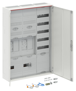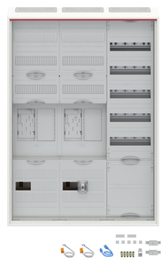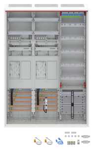 Zählerschrank, Baureihe ComfortLine A, Komplettschrank, mit BKE-I, Anbaumöglichkeit: seitlich, Montageart: Aufputz, Unterputz, teilversenkt, für den Innenbereich, mit Tür, Schutzklasse II (schutzisoliert), Schutzart IP31, mit VDE-Prüfzeichen, geltende Normen: DIN VDE 0603-1, DIN VDE 0603-2-1, VDE AR-N 4100:2019-04, IK-Code IK07, Bemessungsbetriebsspannung Ue 400V AC 50/60 Hz, Bemessungsstrom In 63 A, pulverbeschichtet, in RAL 9016, Gehäuse aus Stahlblech, Doppeltür, Tür aus Stahlblech, mit Standardverschluss, Türöffnungswinkel 120 Grad, Türanschlag rechts und links, Rückwand aus Stahlblech / Kunststoff, Leitungseinführung oben über Membranflansch montiert, unten über 2x Kabeleinführungsflansch beiliegend, seitlich über Flanschöffnung vorgeprägt, Rückwand Kabeleinführung vorgeprägt, Abmessungen in mm (H x B x T): 1100 x 800 x 215, Zählerplatz verdrahtet, Netzsystem TN-S, 5-polig, Stecktechnik, Netzseitiger Anschlussraum Zählerplatz: mit Sammelschiene, vorbereitet für SH-Schalter, Einspeiseklemmen bis 25 mm², Anlagenseitiger Anschlussraum Zählerplatz: mit Hauptleitungsabzweigklemme, Raum für Zusatzgeräte des eHZ 150 mm, Anzahl Zählerplätze 2, Anzahl Reserveplätze 2, Anzahl Verteilerreihen 5, mit APZ-Raum, Rasteinheit 7 RE, Bauhöhe 3, Feldbreite 3, Platzeinheiten 252, Abdeckungen aus Kunststoff, plombierbarer Schnellverschluss und 90 Grad Druck-Drehverschluss, RAL 7035