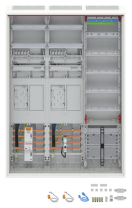 Zählerschrank, Baureihe ComfortLine A, Komplettschrank, mit BKE-I, Anbaumöglichkeit: seitlich, Montageart: Aufputz, Unterputz, teilversenkt, für den Innenbereich, mit Tür, Schutzklasse II (schutzisoliert), Schutzart IP31, mit VDE-Prüfzeichen, geltende Normen: DIN VDE 0603-1, DIN VDE 0603-2-1, VDE AR-N 4100:2019-04, IK-Code IK07, Bemessungsbetriebsspannung Ue 400V AC 50/60 Hz, Bemessungsstrom In 63 A, pulverbeschichtet, in RAL 9016, Gehäuse aus Stahlblech, Doppeltür, Tür aus Stahlblech, mit Standardverschluss, Türöffnungswinkel 120 Grad, Türanschlag rechts und links, Rückwand aus Stahlblech / Kunststoff, Leitungseinführung oben über Membranflansch montiert, unten über 2x Kabeleinführungsflansch beiliegend, seitlich über Flanschöffnung vorgeprägt, Rückwand Kabeleinführung vorgeprägt, Abmessungen in mm (H x B x T): 1100 x 800 x 215, Zählerplatz verdrahtet, Netzsystem TN-S, auch für TT-System geeignet, 5-polig, Stecktechnik, mit Kanal für Steuerzwecke, Netzseitiger Anschlussraum Zählerplatz: mit Sammelschiene, vorbereitet für SH-Schalter, Einspeiseklemmen bis 25 mm², Anlagenseitiger Anschlussraum Zählerplatz: mit Hauptleitungsabzweigklemme, Raum für Zusatzgeräte des eHZ 150 mm, Anzahl Zählerplätze 2, Anzahl Reserveplätze 2, Anzahl Verteilerreihen 5, mit APZ-Raum, Rasteinheit 7 RE, Bauhöhe 3, Feldbreite 3, Platzeinheiten 252, Abdeckungen aus Kunststoff, plombierbarer Schnellverschluss und 90 Grad Druck-Drehverschluss, RAL 7035