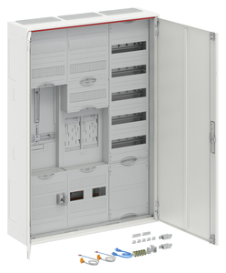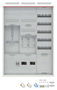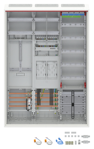 Zählerschrank, Baureihe ComfortLine A, Komplettschrank, mit BKE-I, Anbaumöglichkeit: seitlich, Montageart: Aufputz, Unterputz, teilversenkt, für den Innenbereich, mit Tür, Schutzklasse II (schutzisoliert), Schutzart IP31, mit VDE-Prüfzeichen, geltende Normen: DIN VDE 0603-1, DIN VDE 0603-2-1, VDE AR-N 4100:2019-04, IK-Code IK07, Bemessungsbetriebsspannung Ue 400V AC 50/60 Hz, Bemessungsstrom In 63 A, pulverbeschichtet, in RAL 9016, Gehäuse aus Stahlblech, Doppeltür, Tür aus Stahlblech, mit Standardverschluss, Türöffnungswinkel 120 Grad, Türanschlag rechts und links, Rückwand aus Stahlblech / Kunststoff, Leitungseinführung oben über Membranflansch montiert, unten über 2x Kabeleinführungsflansch beiliegend, seitlich über Flanschöffnung vorgeprägt, Rückwand Kabeleinführung vorgeprägt, Abmessungen in mm (H x B x T): 1100 x 800 x 215, Zählerplatz verdrahtet, Netzsystem TN-S, auch für TT-System geeignet, 5-polig, Stecktechnik, mit Kanal für Steuerzwecke, Netzseitiger Anschlussraum Zählerplatz: mit Sammelschiene, vorbereitet für SH-Schalter, Netzseitiger Anschlussraum SG-Platz: mit LS-Schalter 1-polig B10/25kA plombierbar, Einspeiseklemmen bis 25 mm², Anlagenseitiger Anschlussraum Zählerplatz: mit Hauptleitungsabzweigklemme, Raum für Zusatzgeräte des eHZ 150 mm, Anzahl Zählerplätze 2, Anzahl SG-Plätze 1, Anzahl Verteilerreihen 5, mit APZ-Raum, Rasteinheit 7 RE, Bauhöhe 3, Feldbreite 3, Platzeinheiten 252, Abdeckungen aus Kunststoff, plombierbarer Schnellverschluss und 90 Grad Druck-Drehverschluss, RAL 7035