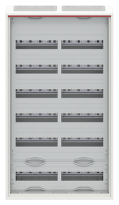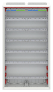 Kleinverteiler, teilausgebauter Schrank, Anbaumöglichkeit: oben und unten, Montageart: Aufputz, für den Innenbereich, mit Tür, Schutzklasse II (schutzisoliert), in Verbindung mit Erdungsset (Zubehör) Schutzklasse I möglich, Schutzart IP44, geltende Normen: DIN EN 61439-1, VDE 0660-600-1, DIN EN 61439-3, VDE 0660-600-3, IK-Code IK07, Bemessungsbetriebsspannung Ue 400V AC 50/60 Hz, Bemessungsstrom In 125 A, bedingt UV beständigpulverbeschichtet, in RAL 9016, Gehäuse aus Stahlblech, einflüglige Tür, Tür aus Stahlblech, in RAL 9016, mit Standardverschluss, Türöffnungswinkel 120 Grad, Türanschlag rechts oder links, Leitungseinführung oben über Membranflansch montiert, unten über Flanschöffnung vorgeprägt, Abmessungen in mm (H x B x T): 950 x 550 x 160, Rasteinheit 6 RE, Feldbreite 2, Platzeinheiten 144, Reihenabstand in mm: 125, Abdeckungen aus Kunststoff, 90 Grad Druck-Drehverschluss, RAL 7035, mit N/PE Quick-Steckklemme, Kabelabfangschiene integriert, ausgebaut mit Verteilerfeld, Geräteträger herausnehmbar