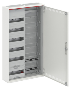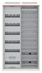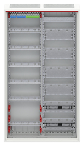 Kleinverteiler, teilausgebauter Schrank, Anbaumöglichkeit: oben und unten, Montageart: Aufputz, für den Innenbereich, mit Tür, Schutzklasse II (schutzisoliert), in Verbindung mit Erdungsset (Zubehör) Schutzklasse I möglich, Schutzart IP30, geltende Normen: DIN EN 61439-1, VDE 0660-600-1, DIN EN 61439-3, VDE 0660-600-3, IK-Code IK07, Bemessungsbetriebsspannung Ue 400V AC 50/60 Hz, Bemessungsstrom In 125 A, bedingt UV beständigpulverbeschichtet, in RAL 9016, Gehäuse aus Stahlblech, Stahlblechtür belüftet, Tür aus Stahlblech, in RAL 9016, mit Standardverschluss, Türöffnungswinkel 120 Grad, Türanschlag rechts oder links, Leitungseinführung oben über Membranflansch montiert, unten über Flanschöffnung vorgeprägt, Abmessungen in mm (H x B x T): 950 x 550 x 160, Rasteinheit 6 RE, Feldbreite 2, Platzeinheiten 72, Reihenabstand: 125, Abdeckungen aus Kunststoff, 90 Grad Druck-Drehverschluss, RAL 7035, mit N/PE Quick-Steckklemme, Kabelabfangschiene integriert, ausgebaut mit Verteilerfeld und Multimediafeld, Geräteträger herausnehmbar