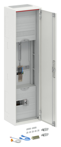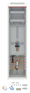 Zählerschrank, Baureihe ComfortLine A, Komplettschrank, mit Zählerkreuz, Anbaumöglichkeit: seitlich, Montageart: Aufputz, Unterputz, teilversenkt, für den Innenbereich, mit Tür, Schutzklasse II (schutzisoliert), Schutzart IP31, mit VDE-Prüfzeichen, geltende Normen: DIN VDE 0603-1, DIN VDE 0603-2-1, VDE AR-N 4100:2019-04, IK-Code IK07, Bemessungsbetriebsspannung Ue 400V AC 50/60 Hz, Bemessungsstrom In 63 A, pulverbeschichtet, in RAL 9016, Gehäuse aus Stahlblech, einflüglige Tür, Tür aus Stahlblech, mit Standardverschluss, Türöffnungswinkel 120 Grad, Türanschlag rechts oder links, Rückwand aus Stahlblech / Kunststoff, Leitungseinführung oben über Membranflansch montiert, unten über 1x Kabeleinführungsflansch beiliegend, seitlich über Flanschöffnung vorgeprägt, Rückwand Kabeleinführung vorgeprägt, Abmessungen in mm (H x B x T): 1100 x 300 x 215, Zählerplatz verdrahtet, Netzsystem TN-S, 5-polig, Direktanschluss, Netzseitiger Anschlussraum Zählerplatz: mit Sammelschiene, vorbereitet für SH-Schalter, Einspeiseklemmen bis 25 mm², Anlagenseitiger Anschlussraum Zählerplatz: mit Hauptleitungsabzweigklemme, Anzahl Zählerplätze 1, Rasteinheit 7 RE, Bauhöhe 3, Feldbreite 1, Platzeinheiten 84, Abdeckungen aus Kunststoff, plombierbarer Schnellverschluss, RAL 7035