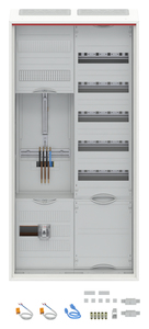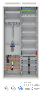 Zählerschrank, Baureihe ComfortLine A, Komplettschrank, mit Zählerkreuz, Anbaumöglichkeit: seitlich, Montageart: Aufputz, Unterputz, teilversenkt, für den Innenbereich, mit Tür, Schutzklasse II (schutzisoliert), Schutzart IP31, mit VDE-Prüfzeichen, geltende Normen: DIN VDE 0603-1, DIN VDE 0603-2-1, VDE AR-N 4100:2019-04, IK-Code IK07, Bemessungsbetriebsspannung Ue 400V AC 50/60 Hz, Bemessungsstrom In 63 A, pulverbeschichtet, in RAL 9016, Gehäuse aus Stahlblech, einflüglige Tür, Tür aus Stahlblech, mit Standardverschluss, Türöffnungswinkel 120 Grad, Türanschlag rechts oder links, Rückwand aus Stahlblech / Kunststoff, Leitungseinführung oben über Membranflansch montiert, unten über 2x Kabeleinführungsflansch beiliegend, seitlich über Flanschöffnung vorgeprägt, Rückwand Kabeleinführung vorgeprägt, Abmessungen in mm (H x B x T): 1100 x 550 x 215, Zählerplatz verdrahtet, Netzsystem TN-S, 5-polig, Direktanschluss, Netzseitiger Anschlussraum Zählerplatz: mit Sammelschiene, vorbereitet für SH-Schalter, Einspeiseklemmen bis 25 mm², Anlagenseitiger Anschlussraum Zählerplatz: mit Hauptleitungsabzweigklemme, Anzahl Zählerplätze 1, Anzahl Verteilerreihen 5, mit APZ-Raum, Rasteinheit 7 RE, Bauhöhe 3, Feldbreite 2, Platzeinheiten 168, Abdeckungen aus Kunststoff, plombierbarer Schnellverschluss und 90 Grad Druck-Drehverschluss, RAL 7035