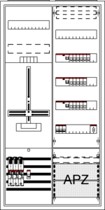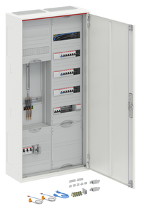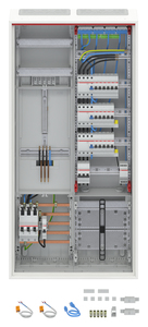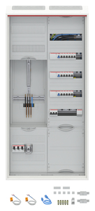 Zählerschrank, Baureihe ComfortLine A, Komplettschrank, mit Zählerkreuz, Anbaumöglichkeit: seitlich, Montageart: Aufputz, Unterputz, teilversenkt, für den Innenbereich, mit Tür, Schutzklasse II (schutzisoliert), Schutzart IP31, mit VDE-Prüfzeichen, geltende Normen: DIN VDE 0603-1, DIN VDE 0603-2-1, VDE AR-N 4100:2019-04, IK-Code IK07, Bemessungsbetriebsspannung Ue 400V AC 50/60 Hz, Bemessungsstrom In 63 A, pulverbeschichtet, in RAL 9016, Gehäuse aus Stahlblech, einflüglige Tür, Tür aus Stahlblech, mit Standardverschluss, Türöffnungswinkel 120 Grad, Türanschlag rechts oder links, Rückwand aus Stahlblech / Kunststoff, Leitungseinführung oben über Membranflansch montiert, unten über 2x Kabeleinführungsflansch beiliegend, seitlich über Flanschöffnung vorgeprägt, Rückwand Kabeleinführung vorgeprägt, Abmessungen in mm (H x B x T): 1100 x 550 x 215, Zählerplatz verdrahtet, Netzsystem TN-S, 5-polig, Direktanschluss, Netzseitiger Anschlussraum Zählerplatz: mit Sammelschiene, mit 1x selektiver Hauptleitungsschutzschalter E40A 3polig, Einspeiseklemmen bis 25 mm², Anlagenseitiger Anschlussraum Zählerplatz: mit Hauptleitungsabzweigklemme, Anzahl Zählerplätze 1, Anzahl Verteilerreihen 5, inkl. folgender Betriebsmittel: Bestückungsvariante Y (HvH): 1x F204-40/0,03 + 6x S201-B16, 2x F204-40/0,03 + 5x S201-B16 inkl. 3x Phasenschienen PS3/10 FI + 2x 1-polig SZ-BSK, 1x S203-B16, 1x Trafo TS16/4-8-12, Zugangsverdrahtung 5-polig, mit APZ-Raum, Rasteinheit 7 RE, Bauhöhe 3, Feldbreite 2, Platzeinheiten 168, Abdeckungen aus Kunststoff, plombierbarer Schnellverschluss und 90 Grad Druck-Drehverschluss, RAL 7035