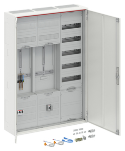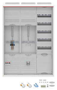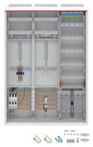 Zählerschrank, Baureihe ComfortLine A, Komplettschrank, mit Zählerkreuz, Anbaumöglichkeit: seitlich, Montageart: Aufputz, Unterputz, teilversenkt, für den Innenbereich, mit Tür, Schutzklasse II (schutzisoliert), Schutzart IP31, mit VDE-Prüfzeichen, geltende Normen: DIN VDE 0603-1, DIN VDE 0603-2-1, VDE AR-N 4100:2019-04, IK-Code IK07, Bemessungsbetriebsspannung Ue 400V AC 50/60 Hz, Bemessungsstrom In 63 A, pulverbeschichtet, in RAL 9016, Gehäuse aus Stahlblech, Doppeltür, Tür aus Stahlblech, mit Standardverschluss, Türöffnungswinkel 120 Grad, Türanschlag rechts und links, Rückwand aus Stahlblech / Kunststoff, Leitungseinführung oben über Membranflansch montiert, unten über 2x Kabeleinführungsflansch beiliegend, seitlich über Flanschöffnung vorgeprägt, Rückwand Kabeleinführung vorgeprägt, Abmessungen in mm (H x B x T): 1100 x 800 x 215, Zählerplatz verdrahtet, Netzsystem TN-S, 5-polig, Direktanschluss, Netzseitiger Anschlussraum Zählerplatz: mit Sammelschiene, mit 1x selektiver Hauptleitungsschutzschalter E50A 3polig, Netzseitiger Anschlussraum SG-Platz: mit LS-Schalter 1-polig B6/25kA plombierbar, Einspeiseklemmen bis 25 mm², Anlagenseitiger Anschlussraum Zählerplatz: mit Hauptleitungsabzweigklemme, Anzahl Zählerplätze 1, Anzahl SG-Plätze 1, Anzahl Verteilerreihen 5, mit APZ-Raum, Rasteinheit 7 RE, Bauhöhe 3, Feldbreite 3, Platzeinheiten 252, Abdeckungen aus Kunststoff, plombierbarer Schnellverschluss und 90 Grad Druck-Drehverschluss, RAL 7035