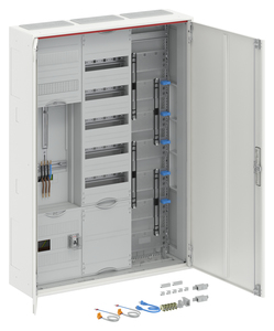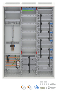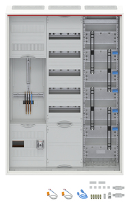 Zählerschrank, Baureihe ComfortLine A, Komplettschrank, mit Zählerkreuz, Anbaumöglichkeit: seitlich, Montageart: Aufputz, Unterputz, teilversenkt, für den Innenbereich, mit Tür, Schutzklasse II (schutzisoliert), Schutzart IP31, mit VDE-Prüfzeichen, geltende Normen: DIN VDE 0603-1, DIN VDE 0603-2-1, VDE AR-N 4100:2019-04, IK-Code IK07, Bemessungsbetriebsspannung Ue 400V AC 50/60 Hz, Bemessungsstrom In 63 A, pulverbeschichtet, in RAL 9016, Gehäuse aus Stahlblech, Doppeltür, Tür aus Stahlblech, mit Standardverschluss, Türöffnungswinkel 120 Grad, Türanschlag rechts und links, Rückwand aus Stahlblech / Kunststoff, Leitungseinführung oben über Membranflansch montiert, unten über 2x Kabeleinführungsflansch beiliegend, seitlich über Flanschöffnung vorgeprägt, Rückwand Kabeleinführung vorgeprägt, Abmessungen in mm (H x B x T): 1100 x 800 x 215, Zählerplatz verdrahtet, Netzsystem TN-S, auch für TT-System geeignet, 5-polig, Direktanschluss, mit Kanal für Steuerzwecke, Netzseitiger Anschlussraum Zählerplatz: mit Sammelschiene, vorbereitet für SH-Schalter, Einspeiseklemmen bis 25 mm², Anlagenseitiger Anschlussraum Zählerplatz: mit Hauptleitungsabzweigklemme, Anzahl Zählerplätze 1, Anzahl Kommunikationfelder 1, Anzahl Verteilerreihen 5, mit APZ-Raum, Rasteinheit 7 RE, Bauhöhe 3, Feldbreite 3, Platzeinheiten 252, Abdeckungen aus Kunststoff, plombierbarer Schnellverschluss und 90 Grad Druck-Drehverschluss, RAL 7035