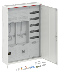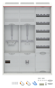 Zählerschrank, Baureihe ComfortLine A, Komplettschrank, mit Zählerkreuz, Anbaumöglichkeit: seitlich, Montageart: Aufputz, Unterputz, teilversenkt, für den Innenbereich, mit Tür, Schutzklasse II (schutzisoliert), Schutzart IP31, mit VDE-Prüfzeichen, geltende Normen: DIN VDE 0603-1, DIN VDE 0603-2-1, VDE AR-N 4100:2019-04, IK-Code IK07, Bemessungsbetriebsspannung Ue 400V AC 50/60 Hz, Bemessungsstrom In 63 A, pulverbeschichtet, in RAL 9016, Gehäuse aus Stahlblech, Doppeltür, Tür aus Stahlblech, mit Standardverschluss, Türöffnungswinkel 120 Grad, Türanschlag rechts und links, Rückwand aus Stahlblech / Kunststoff, Leitungseinführung oben über Membranflansch montiert, unten über 2x Kabeleinführungsflansch beiliegend, seitlich über Flanschöffnung vorgeprägt, Rückwand Kabeleinführung vorgeprägt, Abmessungen in mm (H x B x T): 1100 x 800 x 215, Zählerplatz verdrahtet, Netzsystem TN-S, 5-polig, Zählersteckklemme, Netzseitiger Anschlussraum Zählerplatz: mit Sammelschiene, vorbereitet für SH-Schalter, Netzseitiger Anschlussraum SG-Platz: mit LS-Schalter 1-polig B6/25kA plombierbar, Einspeiseklemmen bis 25 mm², Anlagenseitiger Anschlussraum Zählerplatz: mit Hauptleitungsabzweigklemme, Anzahl Zählerplätze 1, Anzahl SG-Plätze 1, Anzahl Verteilerreihen 5, mit APZ-Raum, Rasteinheit 7 RE, Bauhöhe 3, Feldbreite 3, Platzeinheiten 252, Abdeckungen aus Kunststoff, plombierbarer Schnellverschluss und 90 Grad Druck-Drehverschluss, RAL 7035