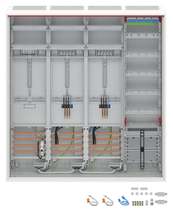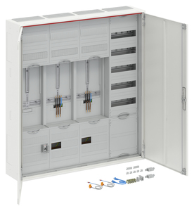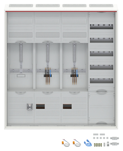 Zählerschrank, Baureihe ComfortLine A, Komplettschrank, mit Zählerkreuz, Anbaumöglichkeit: seitlich, Montageart: Aufputz, Unterputz, teilversenkt, für den Innenbereich, mit Tür, Schutzklasse II (schutzisoliert), Schutzart IP31, mit VDE-Prüfzeichen, geltende Normen: DIN VDE 0603-1, DIN VDE 0603-2-1, VDE AR-N 4100:2019-04, IK-Code IK07, Bemessungsbetriebsspannung Ue 400V AC 50/60 Hz, Bemessungsstrom In 63 A, pulverbeschichtet, in RAL 9016, Gehäuse aus Stahlblech, Doppeltür, Tür aus Stahlblech, mit Standardverschluss, Türöffnungswinkel 120 Grad, Türanschlag rechts und links, Rückwand aus Stahlblech / Kunststoff, Leitungseinführung oben über Membranflansch montiert, unten über 2x Kabeleinführungsflansch beiliegend, seitlich über Flanschöffnung vorgeprägt, Rückwand Kabeleinführung vorgeprägt, Abmessungen in mm (H x B x T): 1100 x 1050 x 215, Zählerplatz verdrahtet, Netzsystem TN-S, auch für TT-System geeignet, 5-polig, Direktanschluss, mit Kanal für Steuerzwecke, Netzseitiger Anschlussraum Zählerplatz: mit Sammelschiene, vorbereitet für SH-Schalter, Steuerleitungsklemme 7-polig schraubenlos, Netzseitiger Anschlussraum SG-Platz: mit LS-Schalter 1-polig B10/25kA plombierbar, mit Querverbindungsleitung, Einspeiseklemmen bis 25 mm², Anlagenseitiger Anschlussraum Zählerplatz: mit Hauptleitungsabzweigklemme, Anzahl Zählerplätze 2, Anzahl SG-Plätze 1, Anzahl Verteilerreihen 5, mit APZ-Raum, Rasteinheit 7 RE, Bauhöhe 3, Feldbreite 4, Platzeinheiten 336, Abdeckungen aus Kunststoff, plombierbarer Schnellverschluss und 90 Grad Druck-Drehverschluss, RAL 7035