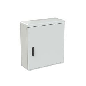 Kabelverteilerschrank mit glatter Oberfläche. Sie haben einen Drei-Punkt-Verschluss mit Schwenkhebelgriff für Profilhalbzylinder. Die Schränke sind aus warm-verpresstem, Glasfaser-verstärktem Polyester, durchgefärbt in RAL 7035 Lichtgrau. Sie sind korrosionsbeständig und UV-beständig und somit für den Außeneinsatz geeignet. Die Gehäuse sind für Umgebungsbedingungen von -35°C bis +70°C geeignet. Die geöffnete Tür kann durch entfernen der Scharnierstifte leicht demontiert werden, für optimalen Zugang zum Schrank. Der Tür-Öffnungswinkel ist größer als 180°. Es gibt eingepresste Kernlöcher in der Rückwand für die Aufnahme von M8 Einpressmuttern zur Befestigung von Sammelschienen, Montagerahmen oder Montageplatte. Die Gehäuse werden mit offenem Boden geliefert, Bodenplatten sind im Zubehör erhältlich. Es gibt Befestigungspunkte in der Seitenwand zur Montage von horizontalen Sammelschienen. Die Gehäuse sind vorgesehen für die Montage auf Sockeln entsprechend DIN 43629 mit Standard-Abmessungen zwischen den Befestigungspunkten. EHF31 Schrank F Gr.1 875x785x320 EH3, glatte Oberfläche, SHG IP44, IK10