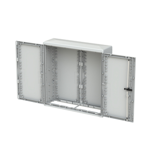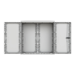 Kabelverteilerschrank mit profilierter Oberfläche. Sie haben einen Drei-Punkt-Verschluss mit Schwenkhebelgriff für Profilhalbzylinder. Die Schränke sind aus warm-verpresstem, Glasfaser-verstärktem Polyester, durchgefärbt in RAL 7035 Lichtgrau. Sie sind korrosionsbeständig und UV-beständig und somit für den Außeneinsatz geeignet. Die Gehäuse sind für Umgebungsbedingungen von -35°C bis +70°C geeignet. Die geöffnete Tür kann durch entfernen der Scharnierstifte leicht demontiert werden, für optimalen Zugang zum Schrank. Der Tür-Öffnungswinkel ist größer als 180°. Es gibt eingepresste Kernlöcher in der Rückwand für die Aufnahme von M8 Einpressmuttern zur Befestigung von Sammelschienen, Montagerahmen oder Montageplatte. Die Gehäuse werden mit offenem Boden geliefert, Bodenplatten sind im Zubehör erhältlich. Es gibt Befestigungspunkte in der Seitenwand zur Montage von horizontalen Sammelschienen. Die Gehäuse sind vorgesehen für die Montage auf Sockeln entsprechend DIN 43629 mit Standard-Abmessungen zwischen den Befestigungspunkten. EHP322 Schrank AP Gr.3 1125x1115x320 EH3, profiliert mit SHG Schutzart IP44, IK10