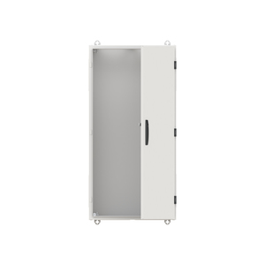 Wandschrank, Baureihe TwinLine, Leerschrank, Anbaumöglichkeit: seitlich und unten, Montageart: Aufputz, für den Innenbereich, mit Tür, Schutzklasse II (schutzisoliert), Schutzart IP55, geltende Normen: DIN EN 61439-1, VDE 0660-600-1, DIN EN 61439-2, VDE 0660-600-2, DIN EN 61439-3, VDE 0660-600-3, IK-Code IK08, pulverbeschichtet, in RAL 7035, Gehäuse aus Stahlblech, einflüglige Tür, Tür aus Stahlblech, mit Standardverschluss Doppelbart 3 mm, Türöffnungswinkel 180 Grad, Türanschlag rechts oder links, Rückwand aus Stahlblech, Leitungseinführung oben über Flanschöffnung ausgeschnitten, unten über Flanschöffnung vorgeprägt, seitlich über Flanschöffnung vorgeprägt, Abmessungen in mm (H x B x T): 1100 x 550 x 225, Rasteinheit 7 RE, Bauhöhe 3, Feldbreite 2, Platzeinheiten 168, vorbereitet für den Ausbau mit Zähler-, Verteilerfelder, Kombi-Sets, CombiLine-Module auf EDF-/WR-Montagegerüst