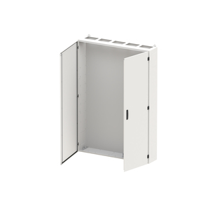 Standschrank, Baureihe TwinLine, Leerschrank, Anbaumöglichkeit: seitlich und unten, Montageart: Aufputz, für den Innenbereich, mit Tür, Schutzklasse I (geerdet), Schutzart IP55, geltende Normen: DIN EN 61439-1, VDE 0660-600-1, DIN EN 61439-2, VDE 0660-600-2, DIN EN 61439-3, VDE 0660-600-3, IK-Code IK08, pulverbeschichtet, in RAL 7035, Gehäuse aus Stahlblech, Doppeltür, Tür aus Stahlblech, mit Standardverschluss Doppelbart 3 mm, Türöffnungswinkel 180 Grad, Türanschlag rechts und links, Rückwand aus Stahlblech, Leitungseinführung oben über Flanschöffnung ausgeschnitten, unten über Flanschöffnung vorgeprägt, seitlich über Flanschöffnung vorgeprägt, Abmessungen in mm (H x B x T): 1850 x 1300 x 275, Rasteinheit 12 RE, Bauhöhe 8, Feldbreite 5, Platzeinheiten 720, vorbereitet für den Ausbau mit Zähler-, Verteilerfelder, Kombi-Sets, CombiLine-Module oder Montageplatten auf EDF-/WR-Montagegerüst