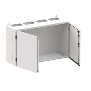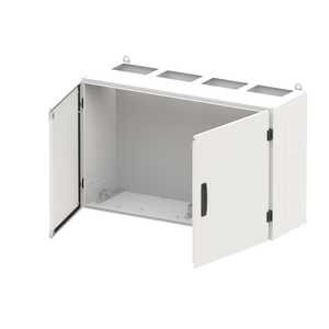 Wandschrank, Baureihe TwinLine, Leerschrank, Anbaumöglichkeit: seitlich und unten, Montageart: Aufputz, für den Innenbereich, mit Tür, Schutzklasse I (geerdet), Schutzart IP55, geltende Normen: DIN EN 61439-1, VDE 0660-600-1, DIN EN 61439-2, VDE 0660-600-2, DIN EN 61439-3, VDE 0660-600-3, IK-Code IK08, pulverbeschichtet, in RAL 7035, Gehäuse aus Stahlblech, Doppeltür, Tür aus Stahlblech, mit Standardverschluss Doppelbart 3 mm, Türöffnungswinkel 180 Grad, Türanschlag rechts und links, Rückwand aus Stahlblech, Leitungseinführung oben über Flanschöffnung ausgeschnitten, unten über Flanschöffnung vorgeprägt, seitlich über Flanschöffnung vorgeprägt, Abmessungen in mm (H x B x T): 650 x 1050 x 350, Rasteinheit 4 RE, Bauhöhe 0, Feldbreite 4, Platzeinheiten 192, vorbereitet für den Ausbau mit Zähler-, Verteilerfelder, Kombi-Sets, CombiLine-Module oder Montageplatten auf EDF-/WR-Montagegerüst