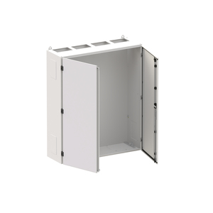 Wandschrank, Baureihe TwinLine, Leerschrank, Anbaumöglichkeit: seitlich und unten, Montageart: Aufputz, für den Innenbereich, mit Tür, Schutzklasse I (geerdet), Schutzart IP55, geltende Normen: DIN EN 61439-1, VDE 0660-600-1, DIN EN 61439-2, VDE 0660-600-2, DIN EN 61439-3, VDE 0660-600-3, IK-Code IK08, pulverbeschichtet, in RAL 7035, Gehäuse aus Stahlblech, Doppeltür, Tür aus Stahlblech, mit Standardverschluss Doppelbart 3 mm, Türöffnungswinkel 180 Grad, Türanschlag rechts und links, Rückwand aus Stahlblech, Leitungseinführung oben über Flanschöffnung ausgeschnitten, unten über Flanschöffnung vorgeprägt, seitlich über Flanschöffnung vorgeprägt, Abmessungen in mm (H x B x T): 1250 x 1050 x 350, Rasteinheit 8 RE, Bauhöhe 4, Feldbreite 4, Platzeinheiten 384, vorbereitet für den Ausbau mit Zähler-, Verteilerfelder, Kombi-Sets, CombiLine-Module oder Montageplatten auf EDF-/WR-Montagegerüst