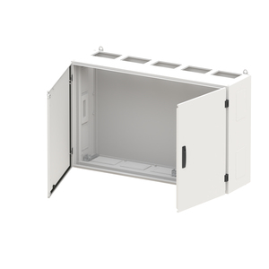 Wandschrank, Baureihe TwinLine, Leerschrank, Anbaumöglichkeit: seitlich und unten, Montageart: Aufputz, für den Innenbereich, mit Tür, Schutzklasse II (schutzisoliert), Schutzart IP55, geltende Normen: DIN EN 61439-1, VDE 0660-600-1, DIN EN 61439-2, VDE 0660-600-2, DIN EN 61439-3, VDE 0660-600-3, IK-Code IK08, pulverbeschichtet, in RAL 7035, Gehäuse aus Stahlblech, Doppeltür, Tür aus Stahlblech, mit Standardverschluss Doppelbart 3 mm, Türöffnungswinkel 180 Grad, Türanschlag rechts und links, Rückwand aus Stahlblech, Leitungseinführung oben über Flanschöffnung ausgeschnitten, unten über Flanschöffnung vorgeprägt, seitlich über Flanschöffnung vorgeprägt, Abmessungen in mm (H x B x T): 800 x 1300 x 350, Rasteinheit 5 RE, Bauhöhe 1, Feldbreite 5, Platzeinheiten 300, vorbereitet für den Ausbau mit Zähler-, Verteilerfelder, Kombi-Sets, CombiLine-Module auf EDF-/WR-Montagegerüst