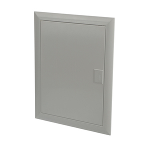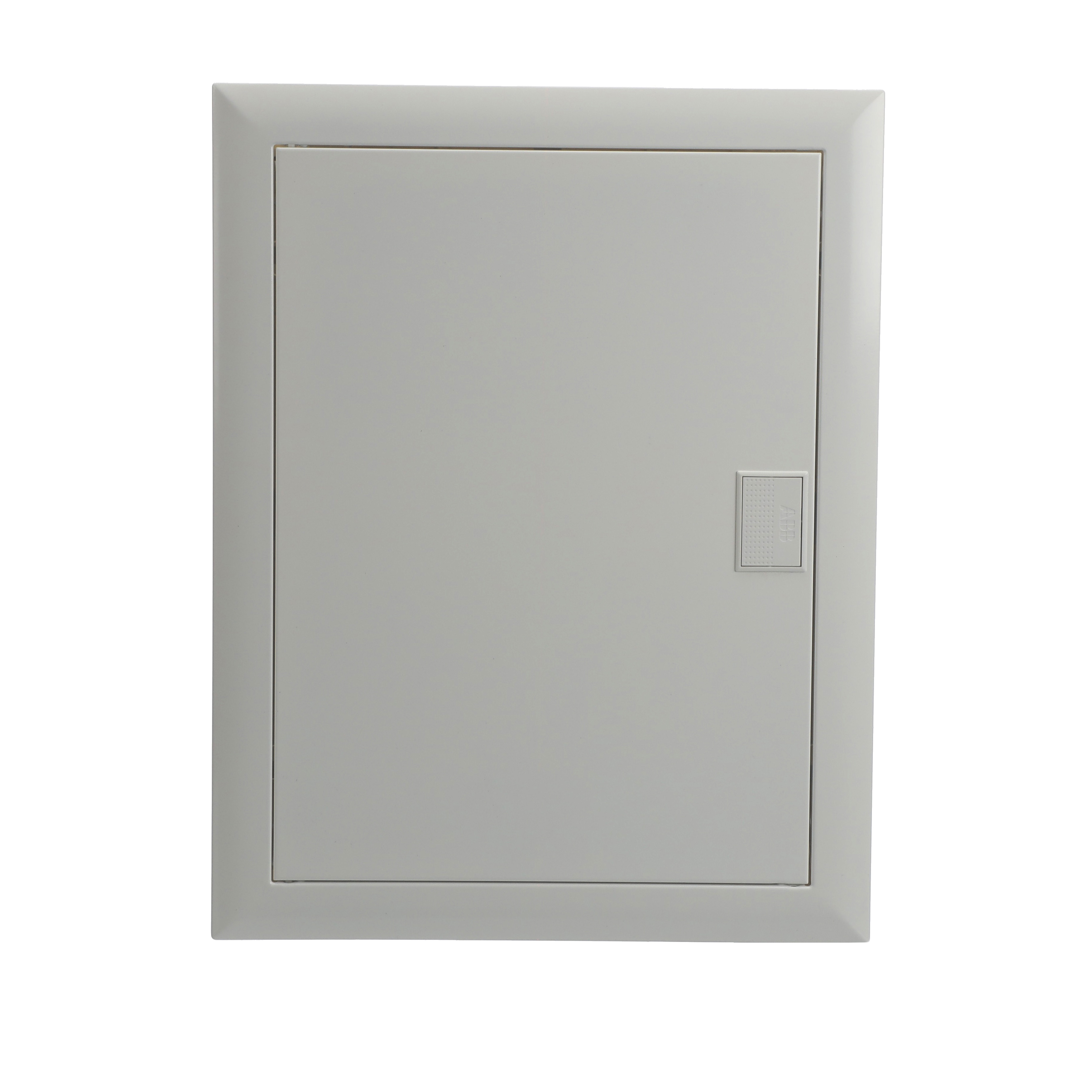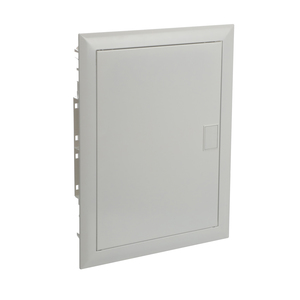 Stromkreisverteiler, Baureihe UK600, Anbaumöglichkeit: seitlich und unten, Montageart: Unterputz, Hohlwand mit Zubehör, teilversenkt, für den Innenbereich, mit Blendrahmen und Tür, Schutzklasse II (schutzisoliert), Schutzart IP30, mit VDE-Prüfzeichen, geltende Normen: DIN 43871, DIN EN 60670-24; VDE 0606-24, IK-Code IK07, Bemessungsbetriebsspannung Ue 400V AC 50/60 Hz, Bemessungsstrom In 63 A, Glühdrahtfestigkeit 850°C, nicht UV beständigpulverbeschichtet, in RAL 9016, Gehäuse aus Thermoplast, mit Blendrahmen und Stahlblechtür, Tür aus Stahlblech, in RAL 9016, mit Tip In-Verschluss, Türöffnungswinkel 120 Grad, Türanschlag rechts oder links, Leitungseinführung oben über Leitungseinführungsschieber vorgeprägt, unten über Leitungseinführungsschieber vorgeprägt, seitlich über Vorprägungen, Rückwand vorgeprägt, Abmessungen in mm (H x B x T): 497 x 384 x 97, Blendrahmenmaße in mm (H x B x T): 497 x 384 x 9, Platzeinheiten 24, Reihenabstand: 125, Abdeckungen aus Kunststoff, 90 Grad Druck-Drehverschluss, mit N/PE Quick-Steckklemme, Kabelabfangschiene integriert, ausgebaut mit Geräteträger, Geräteträger herausnehmbar