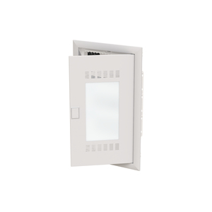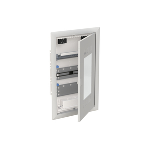 Multimedia-Verteiler, Baureihe UK600, Anbaumöglichkeit: seitlich und unten, Montageart: Unterputz, Hohlwand mit Zubehör, teilversenkt, für den Innenbereich, mit Blendrahmen und Tür, Schutzklasse II (schutzisoliert), Schutzart IP30, geltende Normen: DIN 43871, DIN EN 60670-24; VDE 0606-24, IK-Code IK07, Bemessungsbetriebsspannung Ue 400V AC 50/60 Hz, Bemessungsstrom In 63 A, Glühdrahtfestigkeit 850°C, nicht UV beständigpulverbeschichtet, in RAL 9016, Gehäuse aus Thermoplast, mit Blendrahmen und belüfteter halb-transparenter Stahlblechtür für WLAN, Tür aus Stahlblech, in RAL 9016, mit Tip In-Verschluss, Türöffnungswinkel 120 Grad, Türanschlag rechts oder links, Leitungseinführung oben über Leitungseinführungsschieber vorgeprägt, unten über Leitungseinführungsschieber vorgeprägt, seitlich über Vorprägungen, Rückwand vorgeprägt, Abmessungen in mm (H x B x T): 622 x 384 x 97, Blendrahmenmaße in mm (H x B x T): 622 x 384 x 9, Platzeinheiten 36, Kabelabfangschiene integriert, ausgebaut mit Patchpanel, Montageplatte für Multimediaanwendungen und 3-fach Steckdose drehbar