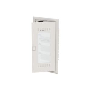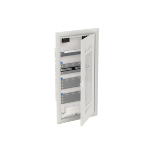 Multimedia-Verteiler, Baureihe UK600, Anbaumöglichkeit: seitlich und unten, Montageart: Unterputz, Hohlwand mit Zubehör, teilversenkt, für den Innenbereich, mit Blendrahmen und Tür, Schutzklasse II (schutzisoliert), Schutzart IP30, geltende Normen: DIN 43871, DIN EN 60670-24; VDE 0606-24, IK-Code IK07, Bemessungsbetriebsspannung Ue 400V AC 50/60 Hz, Bemessungsstrom In 63 A, Glühdrahtfestigkeit 850°C, nicht UV beständigpulverbeschichtet, in RAL 9016, Gehäuse aus Thermoplast, mit Blendrahmen und belüfteter halb-transparenter Stahlblechtür für WLAN, Tür aus Stahlblech, in RAL 9016, mit Tip In-Verschluss, Türöffnungswinkel 120 Grad, Türanschlag rechts oder links, Leitungseinführung oben über Leitungseinführungsschieber vorgeprägt, unten über Leitungseinführungsschieber vorgeprägt, seitlich über Vorprägungen, Rückwand vorgeprägt, Abmessungen in mm (H x B x T): 747 x 384 x 97, Blendrahmenmaße in mm (H x B x T): 747 x 384 x 9, Platzeinheiten 48, Kabelabfangschiene integriert, ausgebaut mit Patchpanel, Montageplatte für Multimediaanwendungen und 3-fach Steckdose drehbar