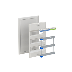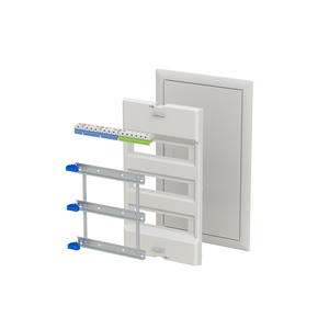 Projektphasen Lieferform als Aussbau Set UK63.. Bestehend aus Kunststoff Geräteabdeckung, Geräteträger mit lösbaren Hutprofilschienen, Blendrahmen und Tür Sahlblech pulverbeschichtet, Farbe: alpinweiß, RAL 9016 und modularen N/PE Quicksteck-Klemmen