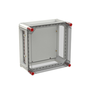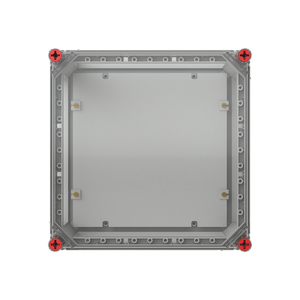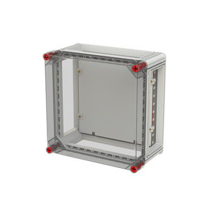 VMS 33 Montageplattengehäuse mit transparentem Deckel. HxBxT: 320 x 320 x 179 mm. Gehäuse mit vier offenen Seiten ohne Verschluss oder Kombiflanschen. PERTINAX-Montageplatte 260x260x5 mm