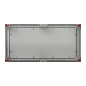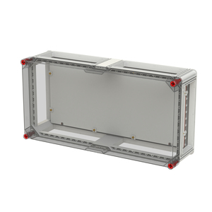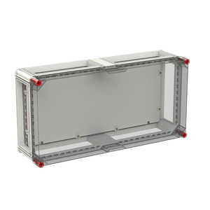 VMS 63 Montageplattengehäuse mit transparentem Deckel. HxBxT: 640 x 320 x 179 mm. Gehäuse mit vier offenen Seiten ohne Verschluss oder Kombiflanschen. PERTINAX-Montageplatte 580x260x5 mm