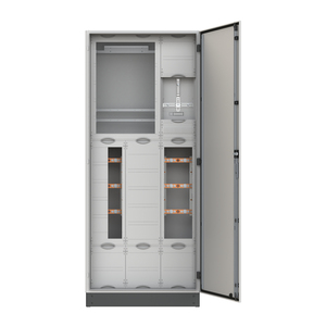 Mess- und Wandlerschrank, Baureihe TwinLine, Komplettschrank, Montageart: Aufputz, für den Innenbereich, mit Tür, Schutzklasse I (geerdet), Schutzart IP55, geltende Normen: DIN EN 61439-1, VDE 0660-600-1, DIN EN 61439-2, VDE 0660-600-2, Bemessungsbetriebsspannung Ue 415V AC 50/60 Hz, Bemessungsstrom In 420 A, Bemessungsstrom der Schaltgerätekombination InA 420 A, pulverbeschichtet, in RAL 7035, Gehäuse aus Stahlblech, einflüglige Tür, Abmessungen in mm (H x B x T): 1950 x 800 x 400, Netzsystem TN-S, 5-polig, Zählerwechselplatte Zählerwechseltafel Größe 1/2 oder 2 (KF421, KF414), Lastbereich: Sammelschienensystem Cu-Schienen 30 x 10 mm 5-polig, Trennstelle vor dem Wandler Platz für 1 Sicherungslastleisten ABB ZHBM(1/2/3) + 1 Reserveplatz 100 mm breite, Wandlerbereich Wandlerauflage mit herausnehmbarer Wandlerlasche 170 x 40 x 10 mm, Ritz: EKS 79-05, EKS 95-06, EKSO 85, EKSO 105, EKSO 161, EKSO 361, EKSS 84, EKSS 85, EKSS 104, EKSS 105, EKSS 152, EKSS 352, MBS: EASK 51.4, EASK 51.6, EASK 61.4, EASK 61.6 (Beistellung NB), Trennstelle nach dem Wandler Platz für 2 Sicherungslastleisten ABB ZHBM(1/2/3), PE+N-Schiene Cu 30 x 10 mm, Rasteinheit 12 RE, Bauhöhe 8, Feldbreite 3, Platzeinheiten 432, Abdeckungen aus Kunststoff, plombierbarer Schnellverschluss, RAL 7035