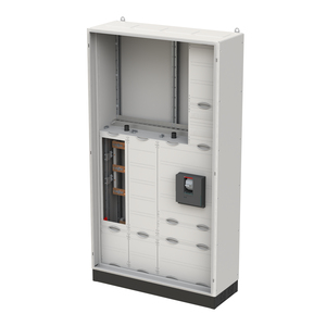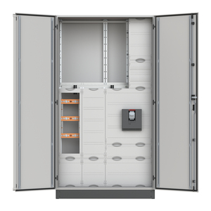 Mess- und Wandlerschrank, Baureihe TwinLine, Komplettschrank, Montageart: Aufputz, für den Innenbereich, mit Tür, Schutzklasse II (schutzisoliert), Schutzart IP55, geltende Normen: DIN EN 61439-1, VDE 0660-600-1, DIN EN 61439-2, VDE 0660-600-2, Bemessungsbetriebsspannung Ue 415V AC 50/60 Hz, Bemessungsstrom In 585 A, Bemessungsstrom der Schaltgerätekombination InA 585 A, pulverbeschichtet, in RAL 7035, Gehäuse aus Stahlblech, Doppeltür, Abmessungen in mm (H x B x T): 1950 x 1050 x 400, Netzsystem TN-S, auch für TT-System geeignet, 5-polig, Zählerwechselplatte KF140SB oder KF142, Lastbereich: Sammelschienensystem Cu-Schienen 50 x 10 mm 5-polig, Trennstelle vor dem Wandler Platz für 2 Sicherungslastleisten ABB ZHBM(1/2/3), Wandlerbereich Wandlerauflage mit herausnehmbarer Wandlerlasche 250 x 40 x 10 mm, Ritz: EKS 79-05, EKS 95-06, EKSO 85, EKSO 105, EKSO 161, EKSO 361, EKSS 84, EKSS 85, EKSS 104, EKSS 105, EKSS 152, EKSS 352, MBS: EASK 51.4, EASK 51.6, EASK 61.4, EASK 61.6 (Beistellung NB), Trennstelle nach dem Wandler Lastschalter 1250 A / 3-polig, PE+N-Schiene Cu 50 x 10 mm, Rasteinheit 12 RE, Bauhöhe 8, Feldbreite 4, Platzeinheiten 576, Abdeckungen aus Kunststoff, plombierbarer Schnellverschluss, RAL 7035