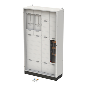 Mess- und Wandlerschrank, Baureihe TwinLine, Komplettschrank, mit Zählerkreuz, Montageart: Aufputz, für den Innenbereich, mit Tür, Schutzklasse I (geerdet), Schutzart IP55, geltende Normen: DIN EN 61439-1, VDE 0660-600-1, DIN EN 61439-2, VDE 0660-600-2, Bemessungsbetriebsspannung Ue 415V AC 50/60 Hz, Bemessungsstrom In 585 A, Bemessungsstrom der Schaltgerätekombination InA 585 A, pulverbeschichtet, in RAL 7035, Gehäuse aus Stahlblech, Doppeltür, Abmessungen in mm (H x B x T): 1950 x 1050 x 400, Netzsystem TN-S, 5-polig, Anzahl Wandlerzählerplatz 1, verdrahtet nach den Vorgaben des NB, Spannungspfad LS-Schalter B6/25 kA 3-polig Überspannungskategorie 3 und Motorschutzschalter 1-1,6A, Lastbereich: Sammelschienensystem Cu-Schienen 50 x 10 mm 5-polig, Trennstelle vor dem Wandler Platz für 4 Sicherungslastleisten ABB ZHBM(1/2/3) hinter der Abdeckung (beistellung EWE Netz), Wandlerbereich Wandlerauflage mit herausnehmbarer Wandlerlasche 250 x 40 x 10 mm, Ritz: EKS 79-05, EKS 95-06, EKSO 85, EKSO 105, EKSO 161, EKSO 361, EKSS 84, EKSS 85, EKSS 104, EKSS 105, EKSS 152, EKSS 352, MBS: EASK 51.4, EASK 51.6, EASK 61.4, EASK 61.6 (Beistellung NB), Trennstelle nach dem Wandler Platz für 2 Sicherungslastleisten ABB ZHBM(1/2/3), PE+N-Schiene Cu 50 x 10 mm, Rasteinheit 12 RE, Bauhöhe 8, Feldbreite 4, Platzeinheiten 576, Abdeckungen aus Kunststoff, plombierbarer Schnellverschluss, RAL 7035