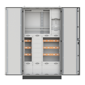 Mess- und Wandlerschrank, Baureihe TwinLine, Komplettschrank, Montageart: Aufputz, für den Innenbereich, mit Tür, Schutzklasse I (geerdet), Schutzart IP55, geltende Normen: DIN EN 61439-1, VDE 0660-600-1, DIN EN 61439-2, VDE 0660-600-2, Bemessungsbetriebsspannung Ue 415V AC 50/60 Hz, Bemessungsstrom In 585 A, Bemessungsstrom der Schaltgerätekombination InA 585 A, pulverbeschichtet, in RAL 7035, Gehäuse aus Stahlblech, Doppeltür, Abmessungen in mm (H x B x T): 1950 x 1050 x 400, Netzsystem TN-S, 5-polig, Zählerwechselplatte Zählerwechseltafel Größe 1/2, 2 oder 3 (KF421, KF414, KF423), Lastbereich: Sammelschienensystem Cu-Schienen 50 x 10 mm 5-polig, Trennstelle vor dem Wandler Platz für 2 Sicherungslastleisten ABB ZHBM(1/2/3), Wandlerbereich Wandlerauflage mit herausnehmbarer Wandlerlasche 250 x 40 x 10 mm, Ritz: EKS 79-05, EKS 95-06, EKSO 85, EKSO 105, EKSO 161, EKSO 361, EKSS 84, EKSS 85, EKSS 104, EKSS 105, EKSS 152, EKSS 352, MBS: EASK 51.4, EASK 51.6, EASK 61.4, EASK 61.6 (Beistellung NB), Trennstelle nach dem Wandler Platz für 4 Sicherungslastleisten ABB ZHBM(1/2/3) + 1 Sicherungslastleisten ABB ZHBM00, PE+N-Schiene Cu 50 x 10 mm, Rasteinheit 12 RE, Bauhöhe 8, Feldbreite 4, Platzeinheiten 576, Abdeckungen aus Kunststoff, plombierbarer Schnellverschluss, RAL 7035